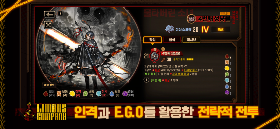 然后再说一下角色,你一开始就拥有所有罪人,选取5个角色进行战斗,剩余的人进行辅助战斗但是并不上场,就是类似于加buff,不过这个buff,需要有对应数量的资源才能触发,这些资源同时也是使用EGO的消耗品,使用ego时会消耗掉一定资源。
