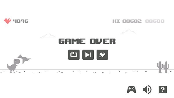 6、如果玩家不小心碰上了障碍物,就会导致游戏结束,三个按钮分别是重试、继续、增加生命值。