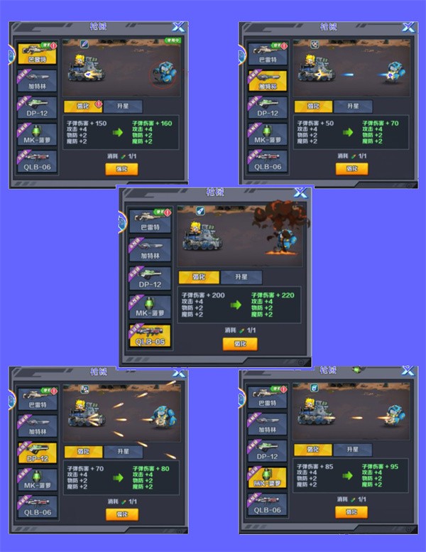 从基础属性来看QLB-06单体爆发最高,适合针对小BOSS,DP-12属于范围伤害,适合击退成群的怪物,而加特林射速最快,综合属性最佳。