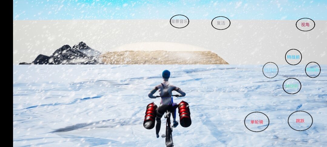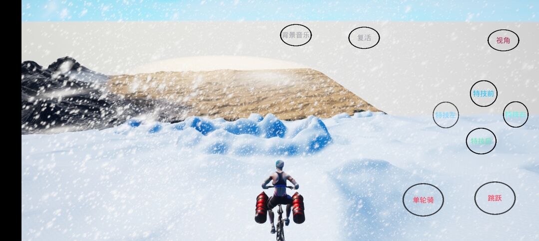 屏幕右侧设有多个带有中文注释的按钮,包括单轮骑、跳跃、向左、向右等,点击相应按钮即可做出对应动作。