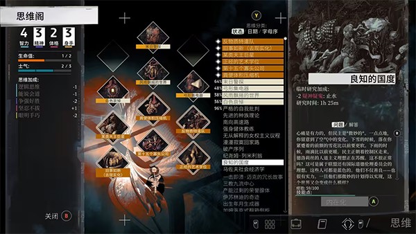 6、在这里思想就是你的装备,将你的养成的想法、研究的线索存起来,在随后的游戏中使用。