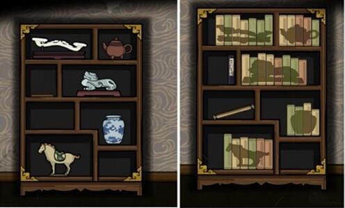 2、点击右边书柜拼好柜中5样物品,再根据右边柜子的图案对应左边的柜子中的实物(注:左边柜子必须根据物品的大小移动到合适的格子,和现实中一样要拿起一件东西再放下另一件东西)。点击左边柜子的第二排第一格,获得③钥匙。