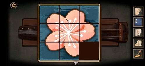 4、点击琴的右侧(琴头小方框)把暗格碎片放入其中,交换位置拼出梅花。把情书和珠钗放入暗格中,给黄衣夫人开门。