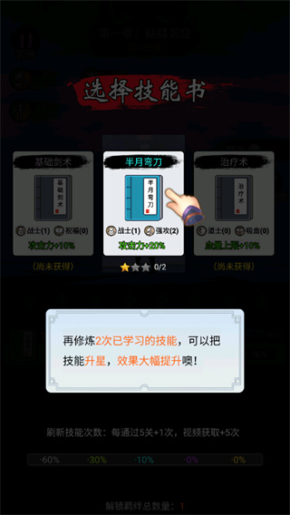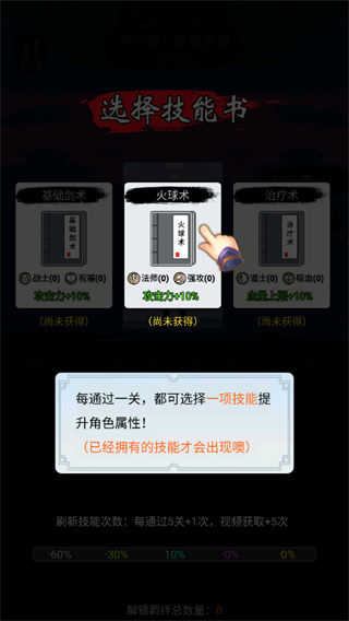 3、每通过一关都可以选择一项技能来提升角色属性,玩家可以在三本技能书中选择一个本进行学习;