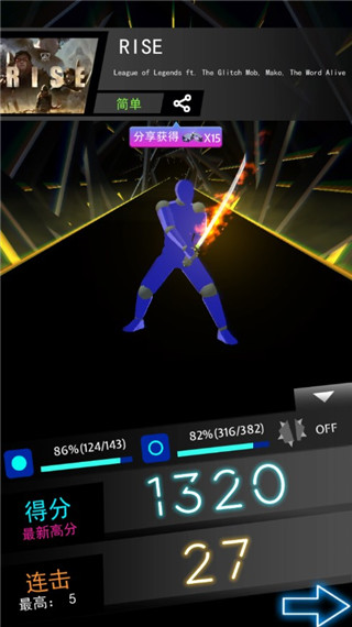 3、在挑战过程中,自由选择自己钟爱的音乐,让你随之节奏舞动手中的武器尽情释放激情。