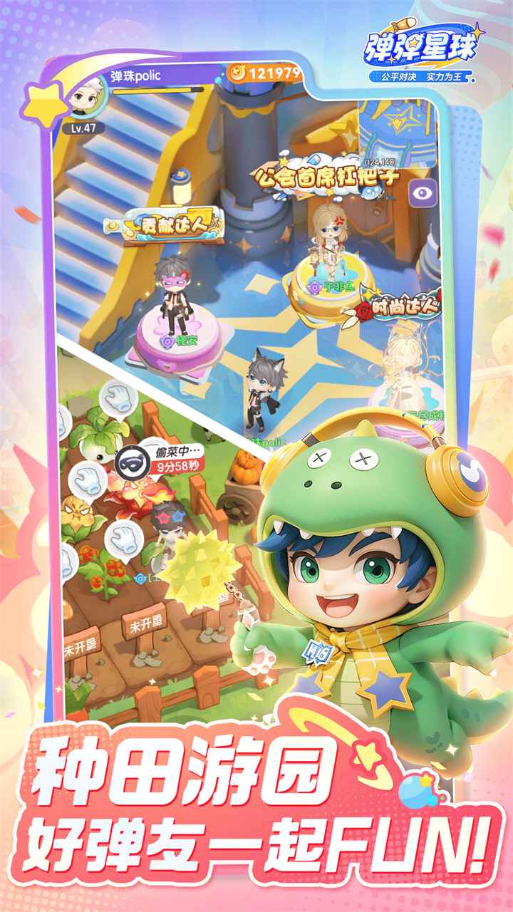 不止是对战,更是社交!加入公会、结识好友、共建花园,和志同道合的伙伴一起组队开黑、互动养成,享受弹射世界的无限温暖与欢乐!