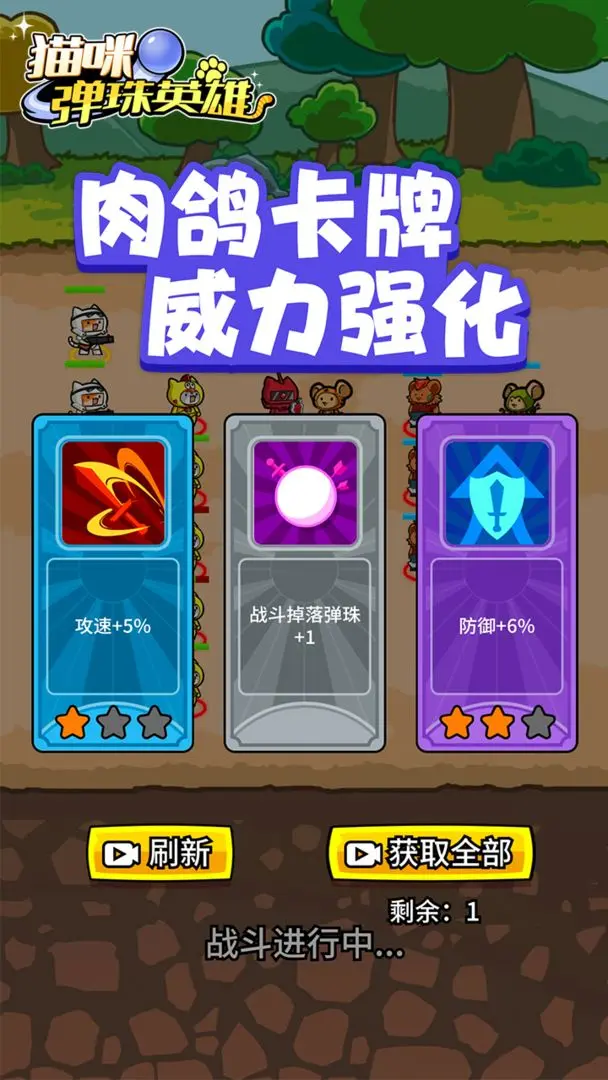1、通过击败鼠鼠可获得能力卡牌,提升猫咪的战斗能力,让你更好的进行挑战。