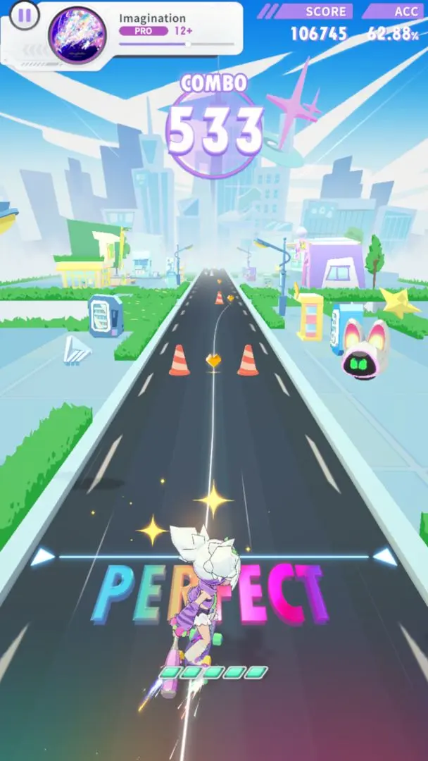 1、音游跑酷双玩法:击打音符与躲避障碍同步进行,节奏越快赛道越复杂。