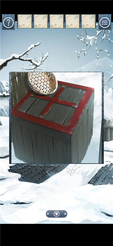 2、继续往左,拿起来木桌上的竹筐,用竹筐把钥匙打捞上来,打开上锁的门(注意这个门是滑动的,要向右滑动才能打开)