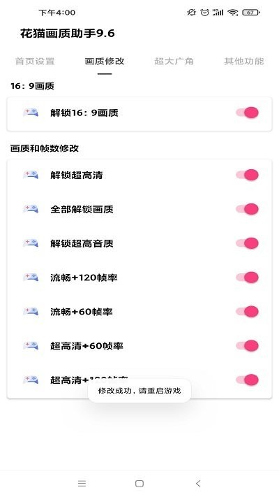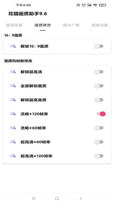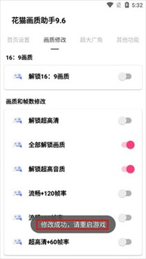 2、点击画质修改,玩家们可使用解锁16:9画质、解锁超高清、全部解锁画质、解锁超高音质、流畅+120+60帧率、超高清+60帧率等功能;