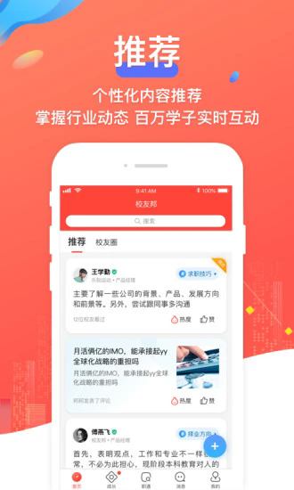 校友邦app是一款功能非常强大的社交类软件,用户可以在这里获取到各种校园的服务体验,其中的功能非常的强大,多种不同的内容可以选择,很容易就可以快速进行操作,用户可以在其中和校友进行交流,了解到班级、校友会、城市等不同的信息内容,还有活动相关的信息可以获取到,其中的信息内容非常的丰富,具有职业相关的信息可以获取到,整体功能非常的实用,让你可以更加紧密的进行联系。