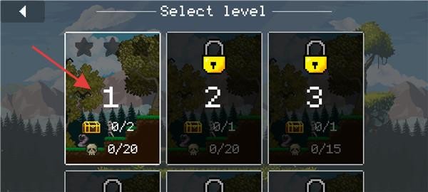 2、在关卡选择界面,选择未锁定的关卡(如箭头所指的关卡1),点击进入游戏场景。