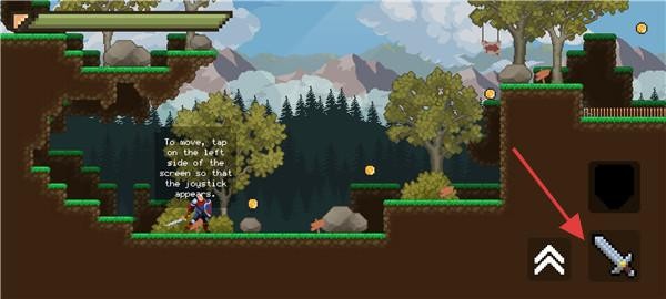 3、进入游戏场景后,按照提示,通过点击屏幕左侧控制方向,点击如箭头所指的剑形按钮进行攻击,开启冒险之旅。