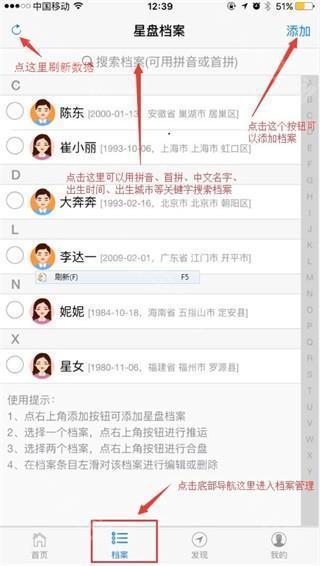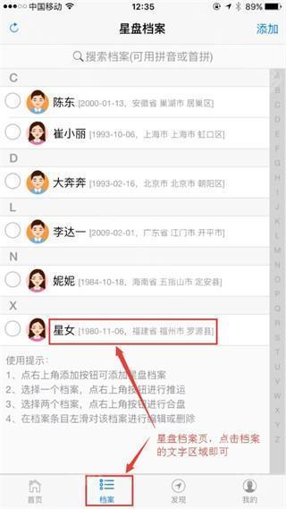 点击app底部导航“档案”即可进入星盘档案管理页面,如果你还没有登录,请先登录