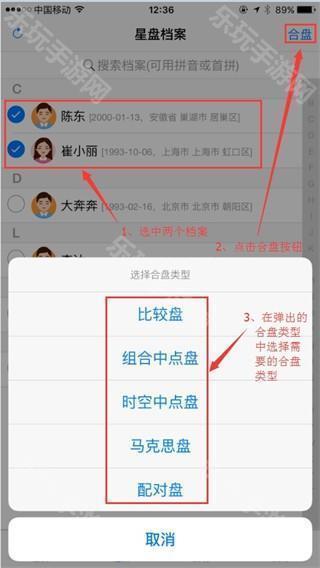 2、或者进入星盘档案页面,选择两个档案,点击右上角的“合盘”按钮,在弹出的合盘类型中选择需要的合盘类型