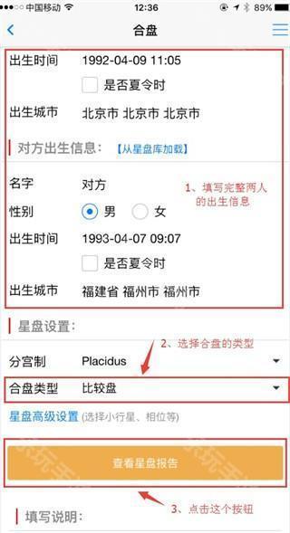 1、进入app“首页”,点击其中的合盘进入,输入需要合盘的两人的出生信息,然后点击“查看星盘报告”