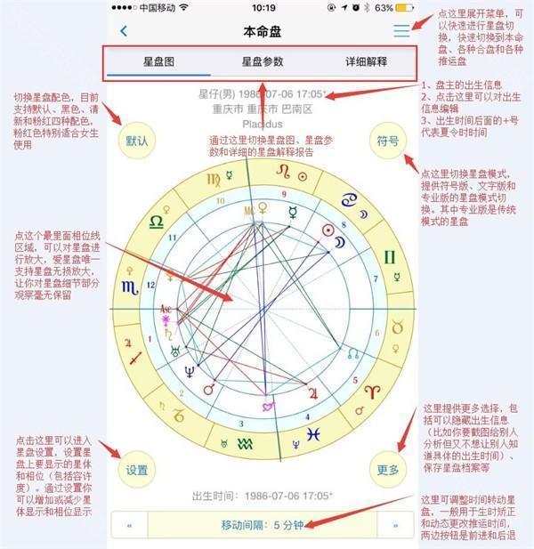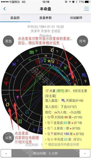 5、点击底部的星盘移动间隔按钮,可以选择不同的移动星盘的时间间,然后通过左右两个,对星盘时间(本命盘时展为出生时间,推运盘时保为准运时间 进行按用时间间隔进行增减,转动星盘