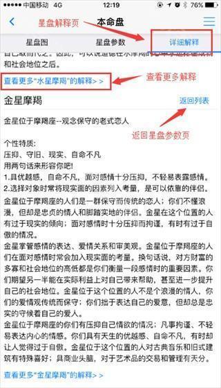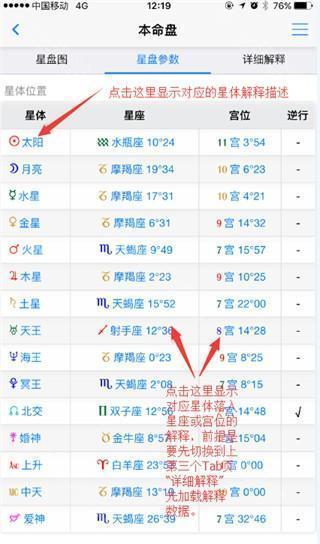 1、通过顶上的Tab选择或者手指左右滑动可以切换星盘图星盘参数列表和详细星盘解释二个内容