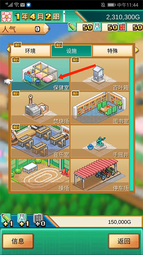 7、进入【设施】界面,包括保健室、百叶箱、图书馆、音乐室、操场等建筑,这里以【保健室】为例,
