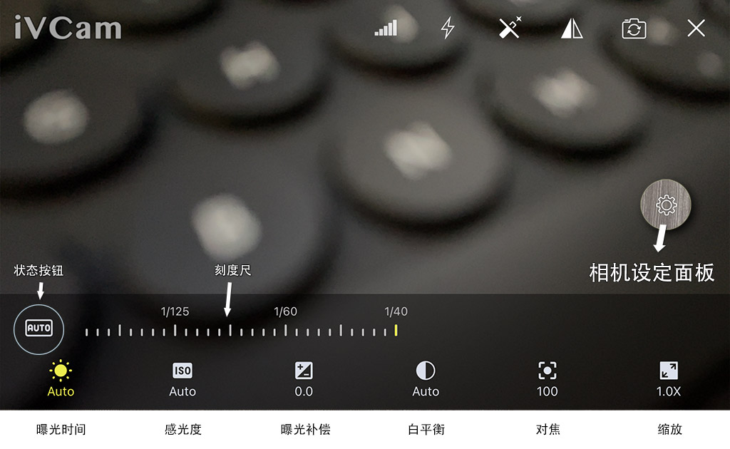 ·使用此面板,您可以调整手机上当前相机的曝光时间、感光度、曝光补偿、白平衡、对焦以及缩放参数的值。
