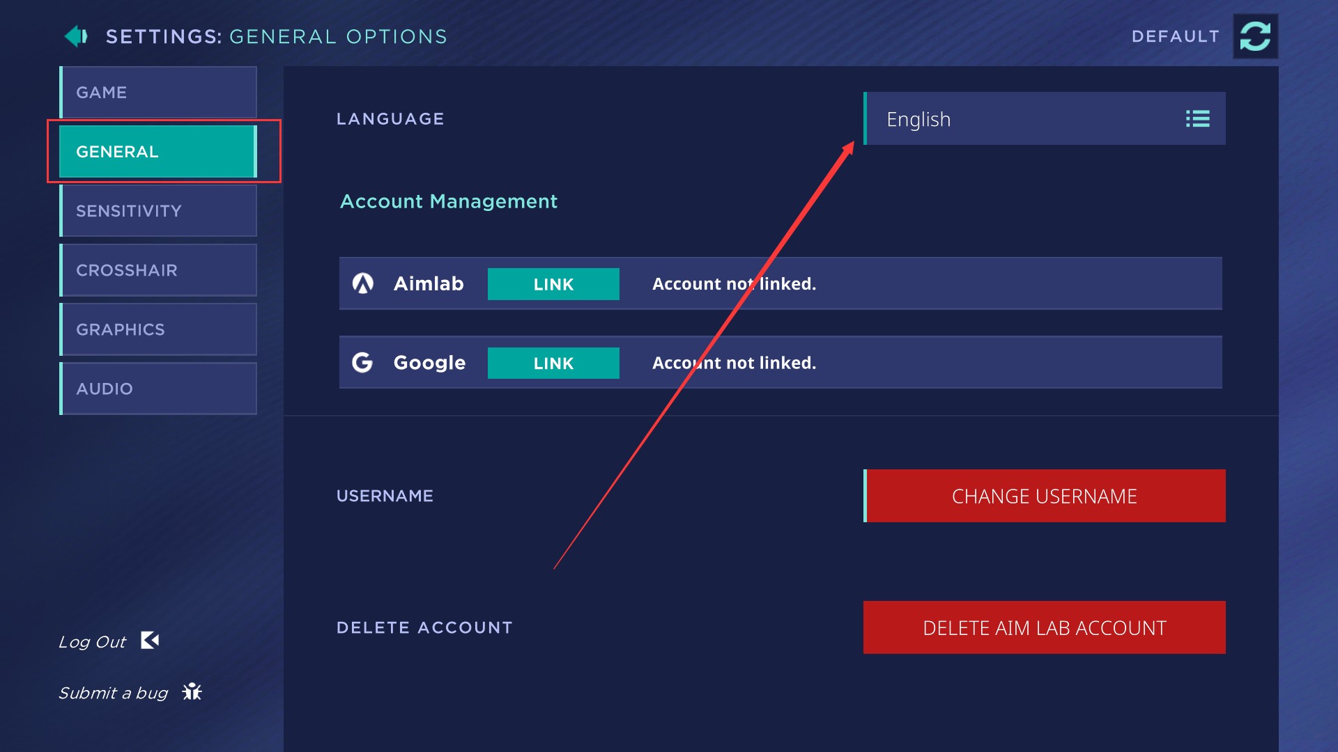 4、点击左侧的GENERAL栏目后点击右侧语言选项栏