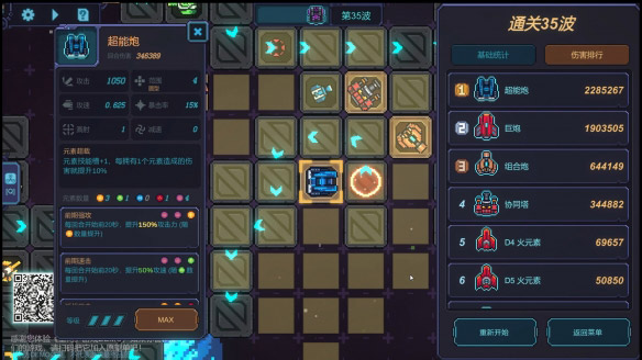 比如我通关这一把,主力输出是这个加农炮,伤害排行第一,依靠三个词缀叠加,可以提高很多输出。元素搭配建议金和木,加基础攻击和攻速,需要一个防护两个强化,增加冻结抗性和输出。