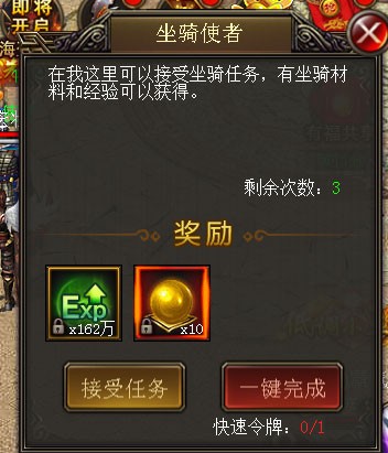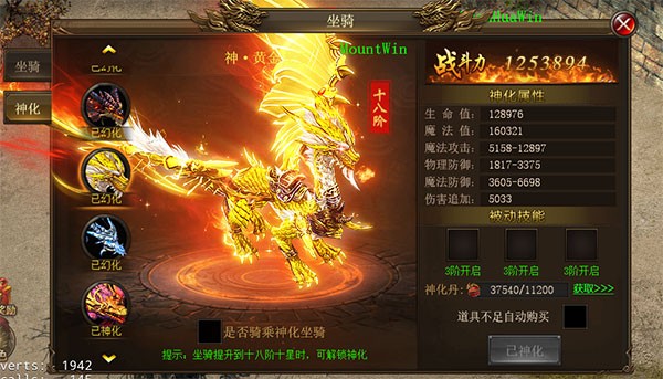神化成长:使用神化丹,可以使当前的坐骑神化,获得发光特效,同时可以激活额外的坐骑技能。
