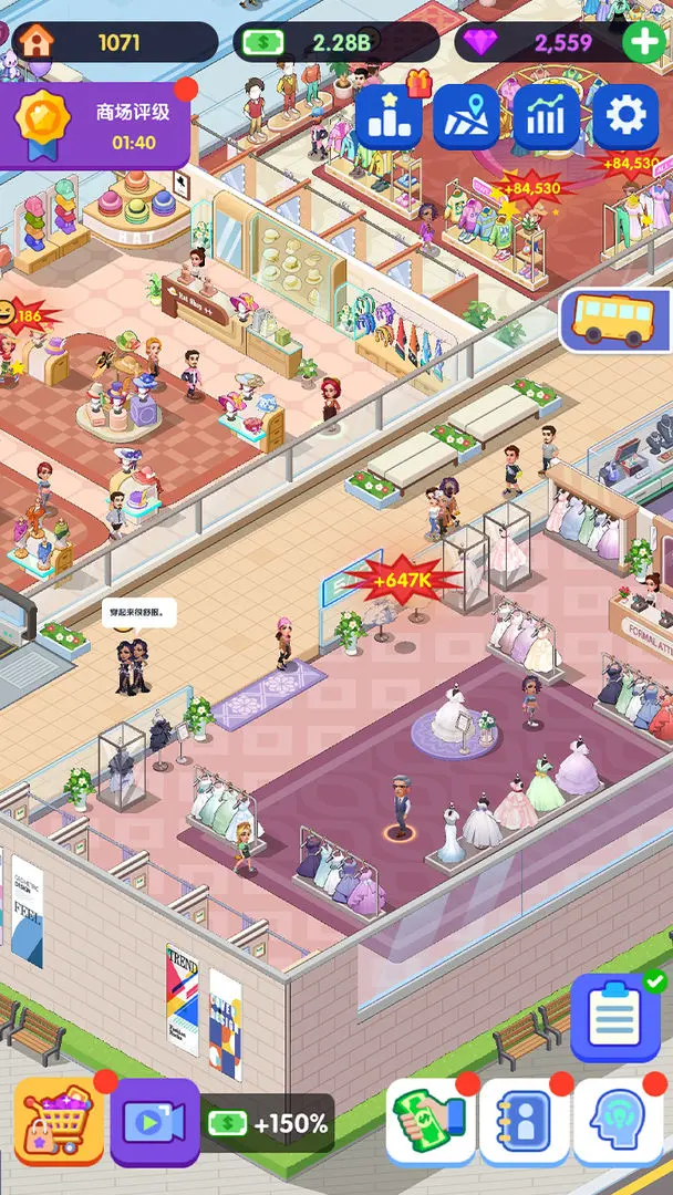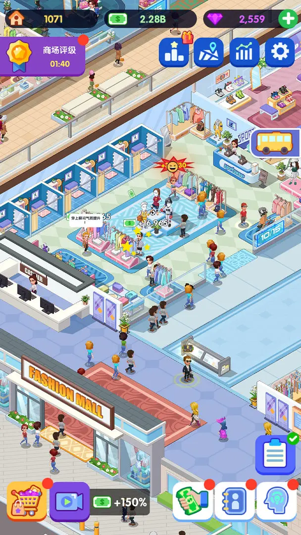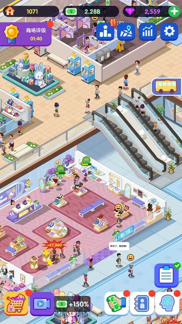 2、在商场场景中,点击指定区域,可进行相关操作,推进服装店升级等经营进程。