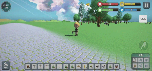 1、采用 Q 版卡通化的植物、动物及建筑模型,搭配鲜艳色彩与动态光影,营造出轻松有趣的荒野生存视觉氛围。