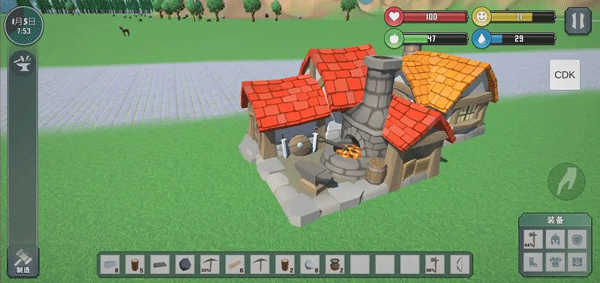 4、自由选择地点,搭建篝火、水井和围栏等设施。解锁农业系统与家禽养殖,打造您专属的荒野家园。