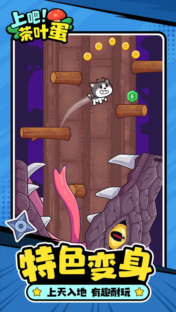 2、手指点击的地方就是你的茶叶蛋英雄跳跃落点,尽量收集金币!游戏采用横版闯关玩法,我们要多多获得金币
