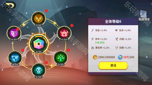 消耗联盟贡献可升级联盟符文,分为主符文和阵营符文,主符文可以给队伍全体英雄提供加成,阵营符文可以给对应阵营的英雄提供加成,二者同时生效。