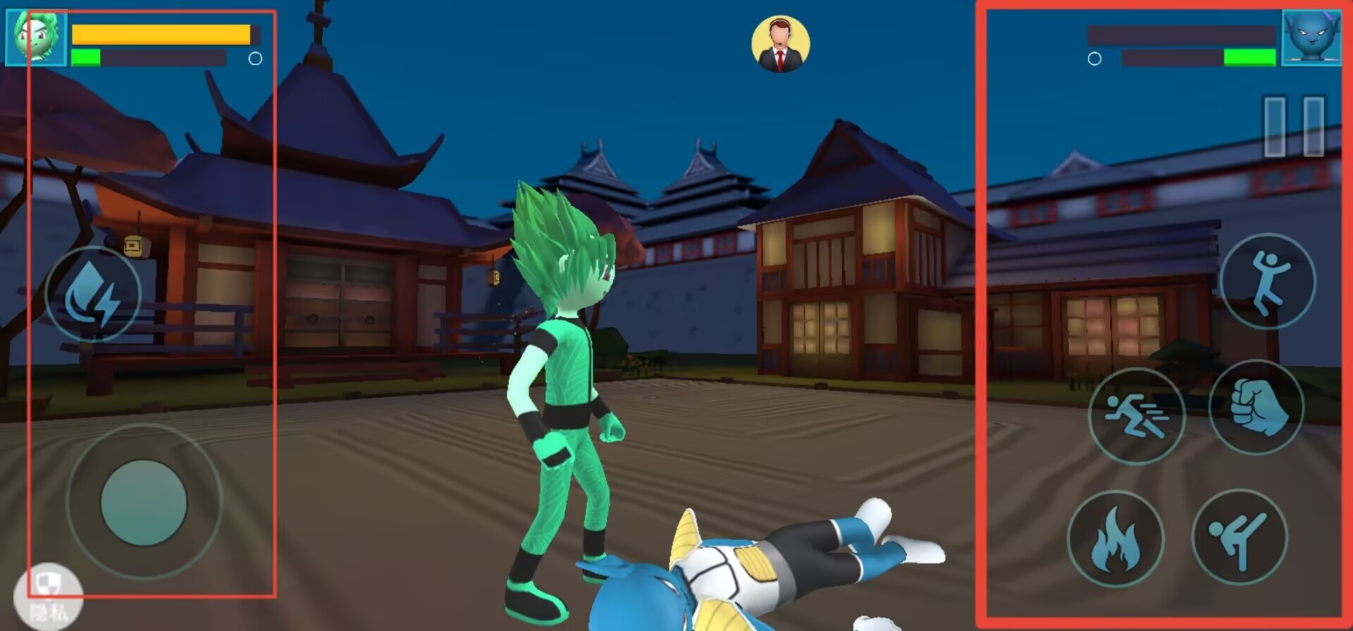 2、对战界面左侧显示角色生命值与移动控制,右侧分布敌方状态显示及跳跃攻击等操作按键。