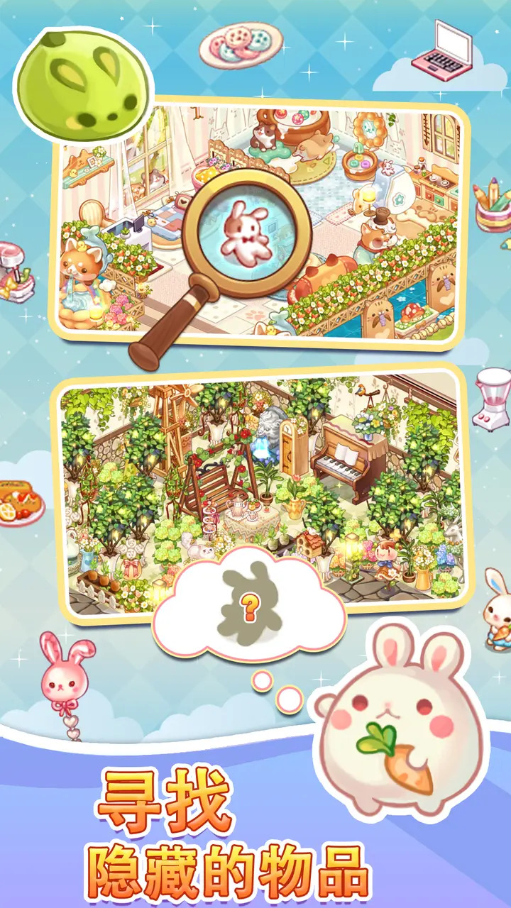 1、萌系画风让玩家们可以以轻松的心情去接受挑战,完成各种收纳与装修任务,获取好心情。
