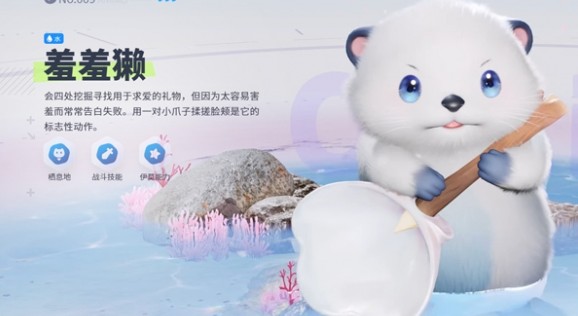 羞羞獭会四处挖掘,寻找用于求爱的礼物。然而,由于它太容易害羞,常常导致告白失败。用一对小爪子揉搓脸颊是它的标志性动作。