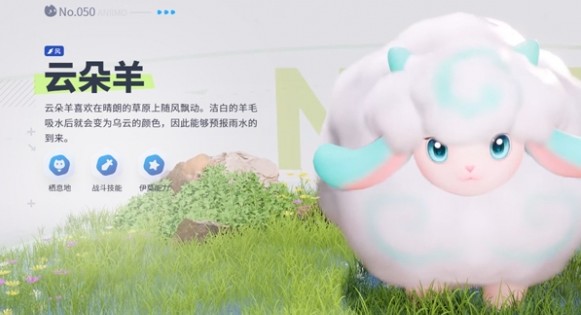 云朵羊喜欢在晴朗的草原上随风悠游。它洁白的羊毛在吸水后会变成乌云的颜色,因此能够预示雨水的到来。