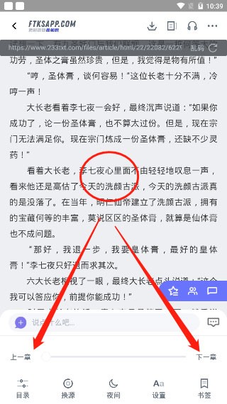 3、现在就来到了小说的阅读的界面,然后在点击手机屏幕中心,在下方的第一栏就能够看见“上一章”“下一章”,点击后我们就能够快速的切换到下一章(或者上一章)的内容。