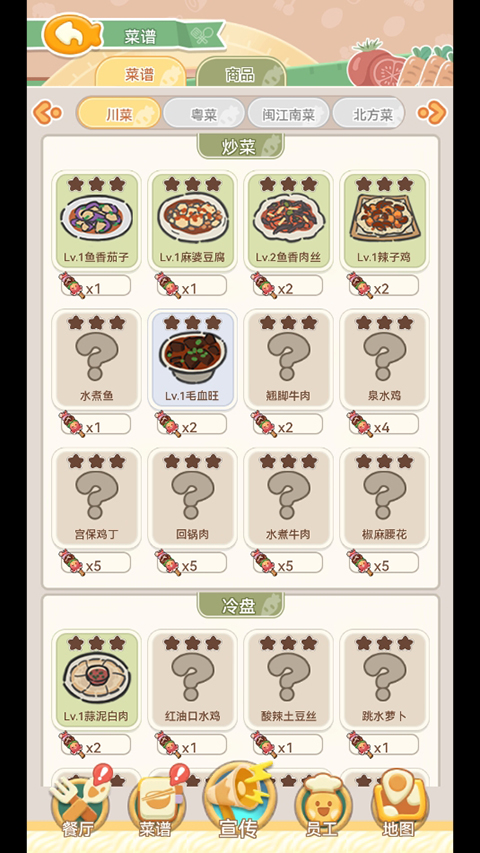 2、根据菜品的品质、口味、成本等属性,研究不同菜系的烹饪方法,解锁新菜品。