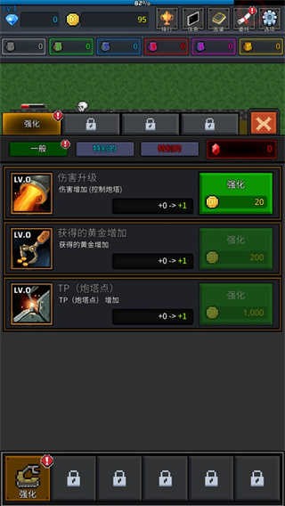 2、当我们有一定的金币之后,就可以去强化伤害和黄金的增加,以及炮塔点的增加;