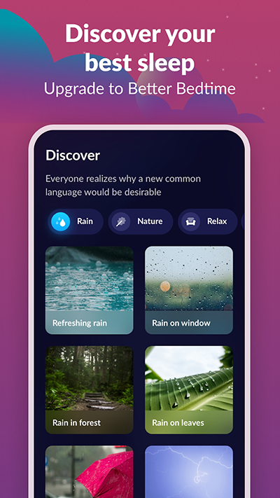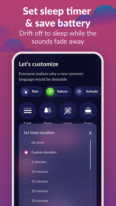 睡眠声音可以帮助失眠的人快速入睡,在助眠音乐的帮助下,人们可以入睡,这个应用有大量的音乐,如自然声音、白噪音、冥想声音和轻音乐,每个人都可以选择播放自己的有效音乐,睡觉前,他们可以选择先播放音乐,定时关闭功能可设置为在指定时间自动关闭音乐,确保手机电池和数据不被浪费。