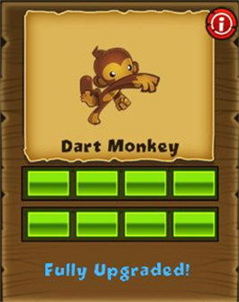 (每发飞镖可以攻击2个气球)→(每发飞镖可以攻击3个气球)→(每次可以发射三枚飞镖)→(增加“变身”技能,把攻击范围内的飞镖猴变成超猴)