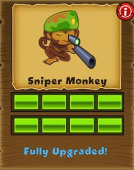 狙击手猴,全屏幕射程,射速慢,初始每枪穿透两层气球,建议点击后选择“strong”攻击模式。