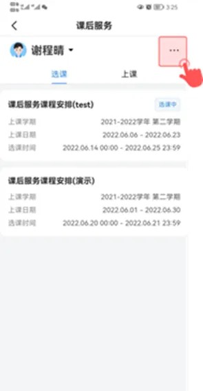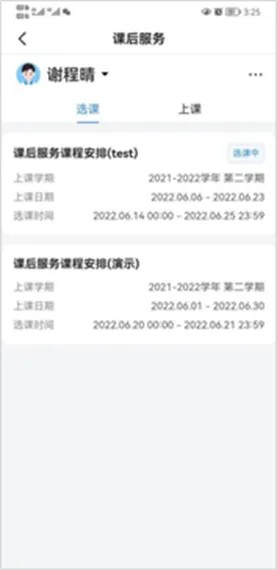 注:若家长在注册登录时,出现认证失败/登录失败的情况,请联系学校。2.选课在进入课后服务后,家长可以点击页面上方导航栏的【选课】和【上课】进行页面的切换查看,若未在学校设定的选课时间段内则无法进行选课,课后服务选课页面上会显示【本学期选课报名已结束】。若家长有多个孩子,在给不同的孩子进行选课时,需点击页面左上角的孩子姓名切换至对应的孩子进行选课。