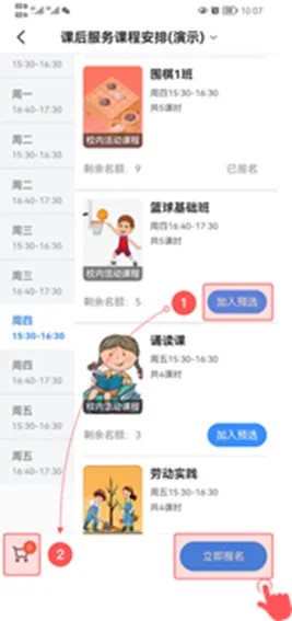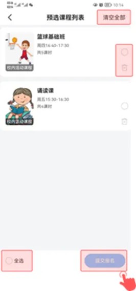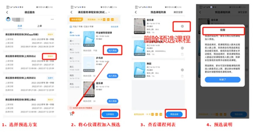如上图所示选择选课方案,进入到选课操作页面。家长可在选课时间内看到孩子对应学段、时间段可报名的所有课程,点击课程右下角【加入预选】按钮,即可将该课程加入类似购物车的【预选课程列表】中,点击页面左下角的按钮,可进入【预选课程列表】页面进行查看和编辑,点击页面左上角的【清空全部】按钮,可清空页面中的所有预选课程。若需单个编辑,家长可点击课程右下侧的删除图标,确认后即可操作去删除单个课程。选课需要注意的是,选课只可在学校设置的选课时间段内方可进行,在非选课时间家长是无法进行选课操作的。只在该课程预选人数超过该课程报名人数上限,则家长需在选课阶段手动报名该课程