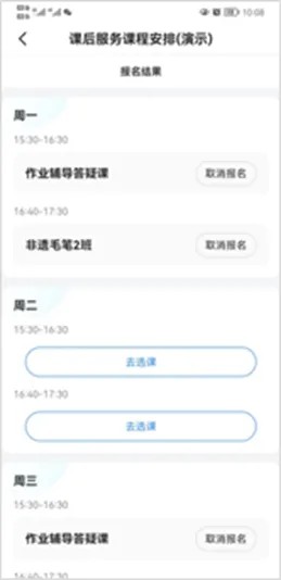 注:①同一节次的教学班只能报名一个;②预排学生系统已自动为学生进行报名,课程状态为“已选”状态,学生不能取消报名;3.退课退课时间:家长在选课期间或退选日期内,可发起退课的申请。退课方式:选课成功后,家长从选课页面,点击页面右上侧的【报名结果】按钮,进入到选课报名结果列表,该页面会按照课节的时间排列选课结果,免费课程,点击课程右侧的【取消报名】,免费课程在此窗口直接退课成功。