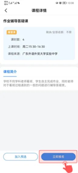 如上图所示,家长可将多个课程加入到【预选课程列表】中,选中多个课程,点击【提交报名】按钮,再【确认报名】,免费课程即可直接报名成功。同时,家长也可以直接在选课页面上点击课程进入到【课程详情】页查看课程详情,点击页面下方的【立即报名】按钮,进行单个课程的报名操作,如下图所示: