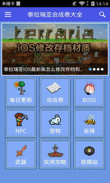 泰拉瑞亚合成表是专为泰拉瑞亚玩家设计的游戏物品合成桌APP,为玩家提供了一个所有游戏项目的综合表,以及许多插图,如BOSS、NPC、武器等,支持玩家搜索和查询,还有丰富的流行游戏视频、游戏教学策略等,帮助玩家更轻松、更有趣地玩游戏。