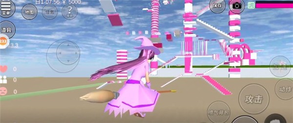 5、如下图所示,看到一个共享小道具,可以骑着扫把开始飞翔,飞往跑酷地图当中;