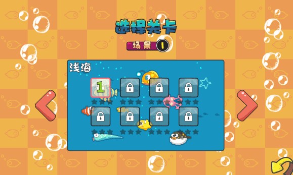 第三十关:海面场景,可以跳出水面吃小虫、气球上的泡泡。