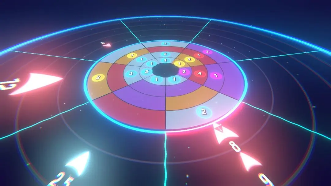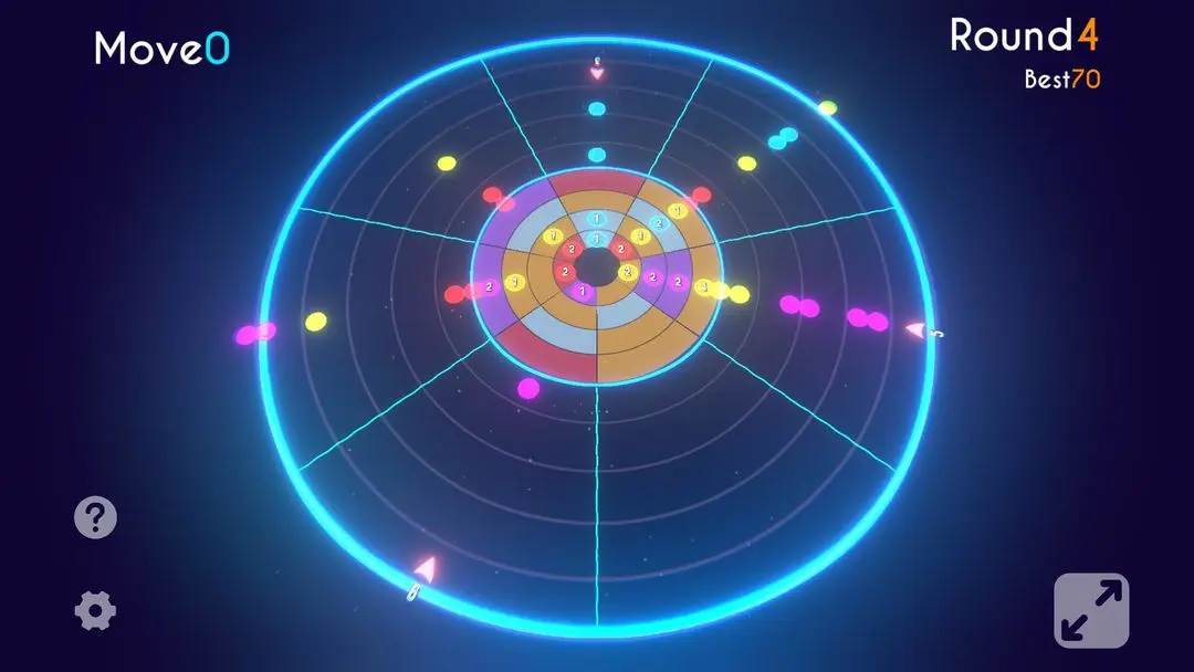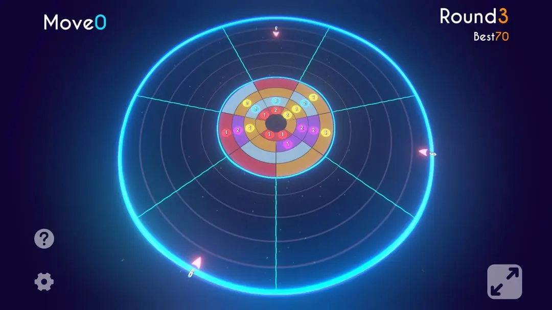 1、在持续旋转的轮盘上滑动带有数字的方块,使相同数字的方块相撞并合并成一个更大的数字。